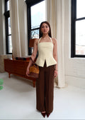A structured yet feminine halter top designed to flatter your shape. Crafted in soft butter yellow, it contours the waist with precise paneling for a close, comfortable fit. The squared neckline and tailored seams accentuate curves, while a subtle front slit — adjustable with a hidden zipper — adds a modern, playful touch. Polished on its own or layered under a blazer.